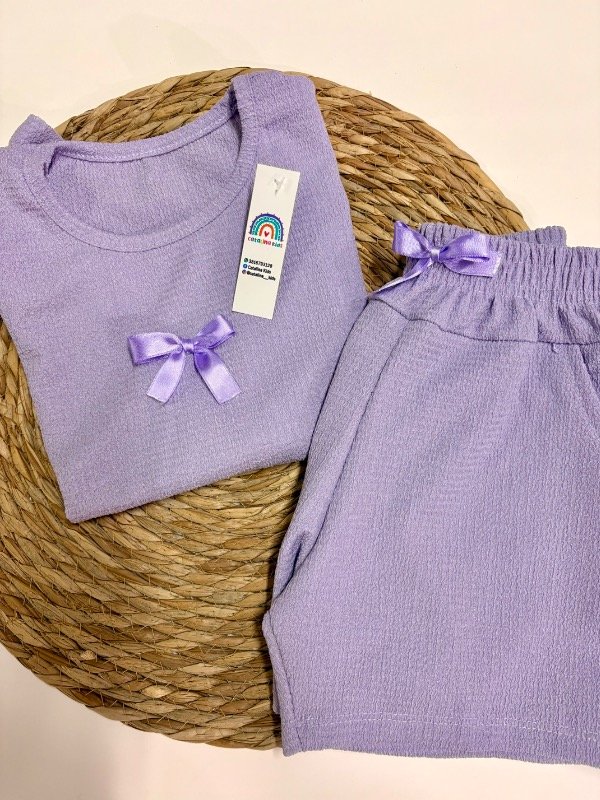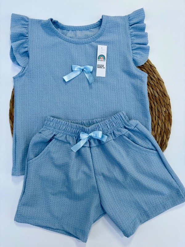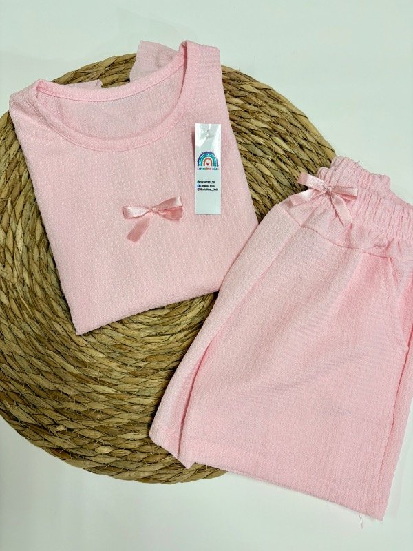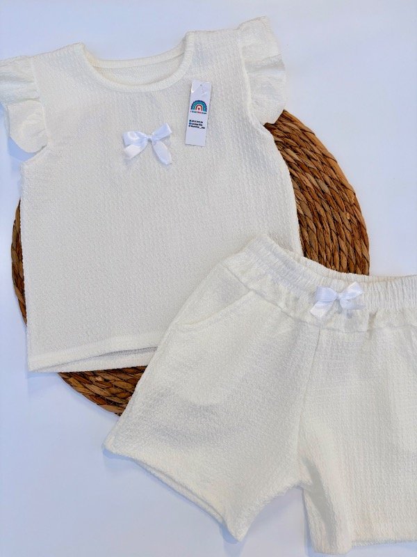 Conjunto confeccionado en tela hawai, suave, liviana y con textura delicada. Compuesto por remera sin mangas con voladitos en los hombros y un pequeño moño decorativo al frente, más short con cintura elastizada para mayor comodidad. Ideal para los días de calor, fresco y cómodo, perfecto para el uso diario o una ocasión especial. Un básico elegante y atemporal que enamora por sus detalles.