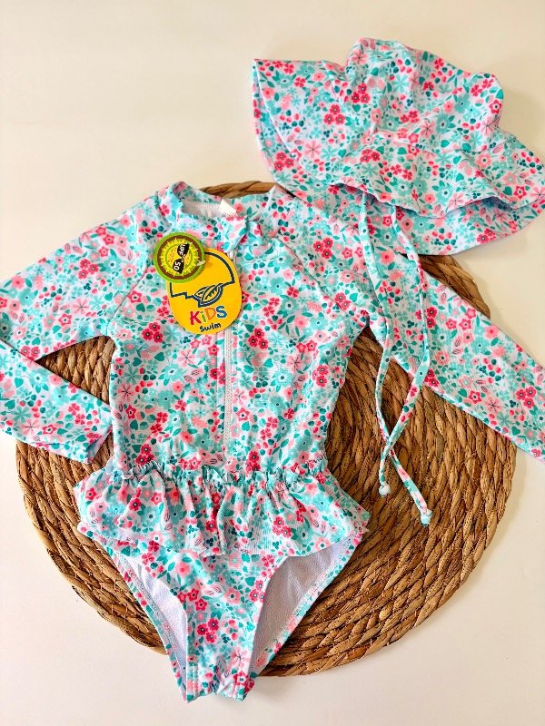 Nuestro conjunto de malla con protección UV50+ es ideal para que las peques disfruten del sol con total comodidad y seguridad. Incluye malla enteriza manga larga y sombrero haciendo juego, ambos con un diseño floral en tonos frescos súper dulce y moderno.