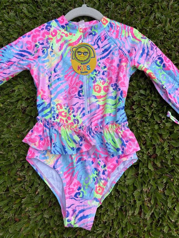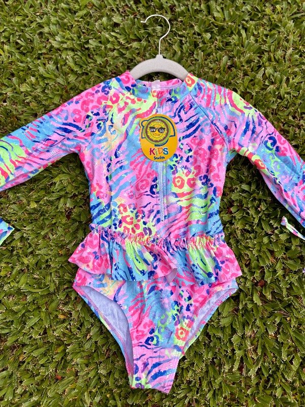 Nuestro conjunto de malla con protección UV50+ es ideal para que las peques disfruten del sol con total comodidad y seguridad. Incluye malla enteriza manga larga y sombrero haciendo juego, ambos con un diseño print en tonos vibrantes súper dulce y moderno.