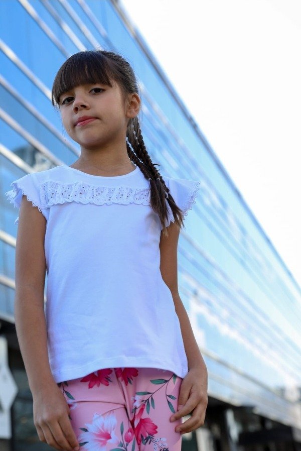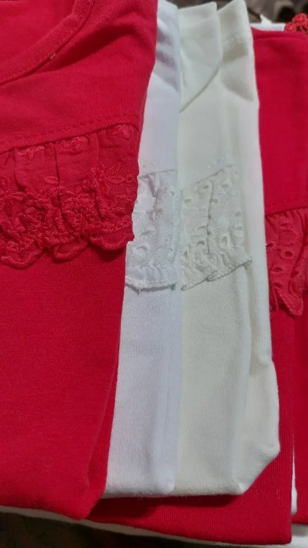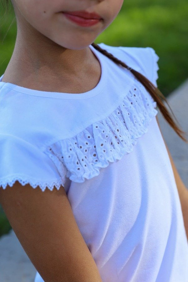 Algodón con lycra y detalles de broderie y puntilla en mangas.