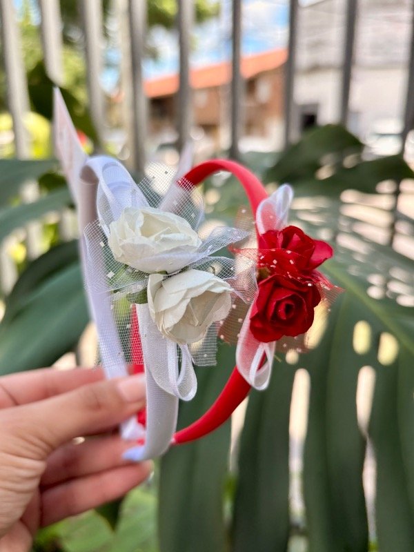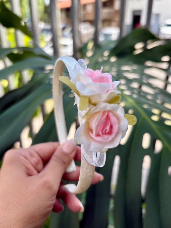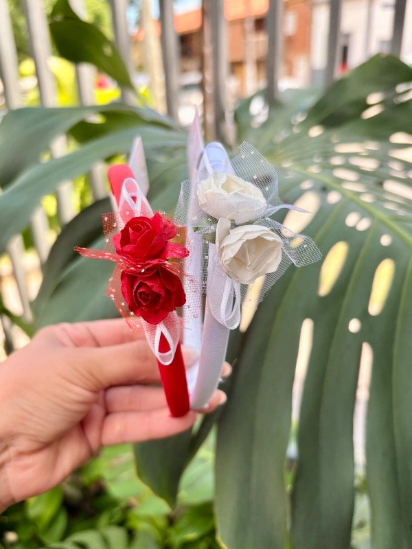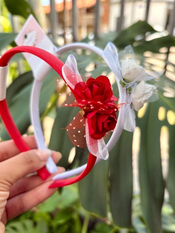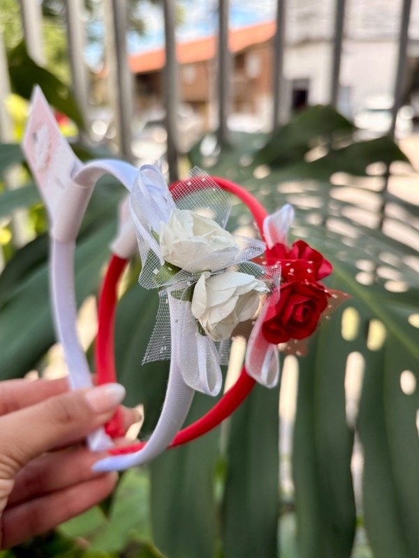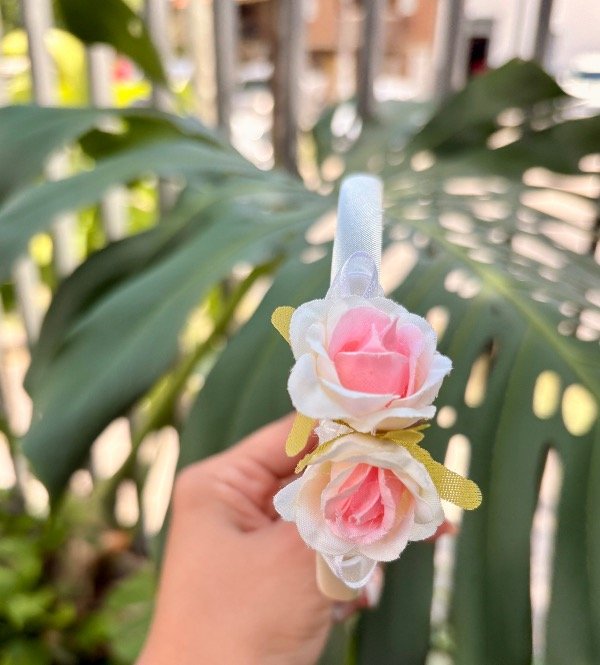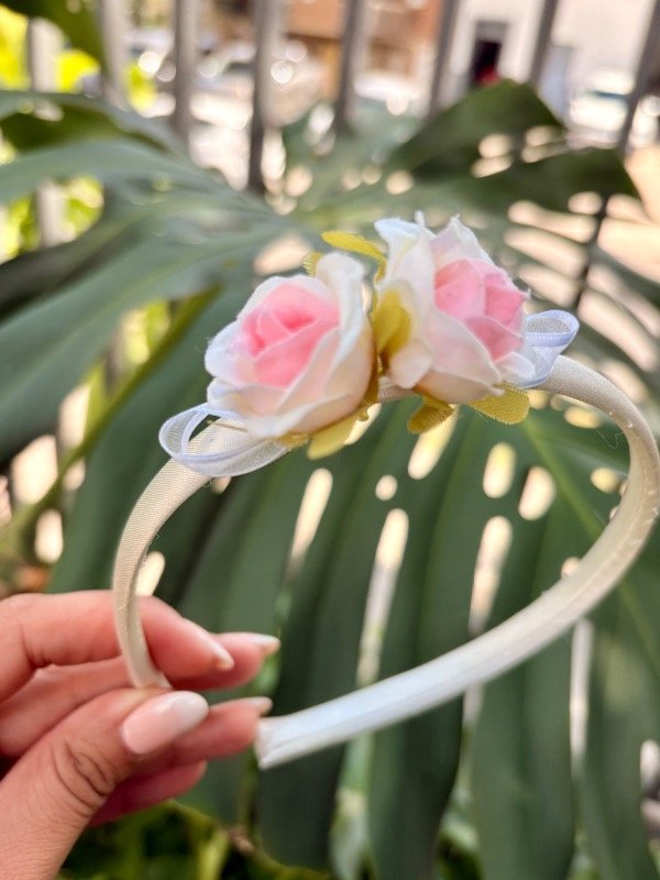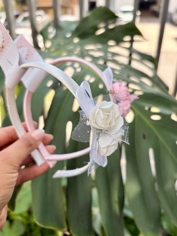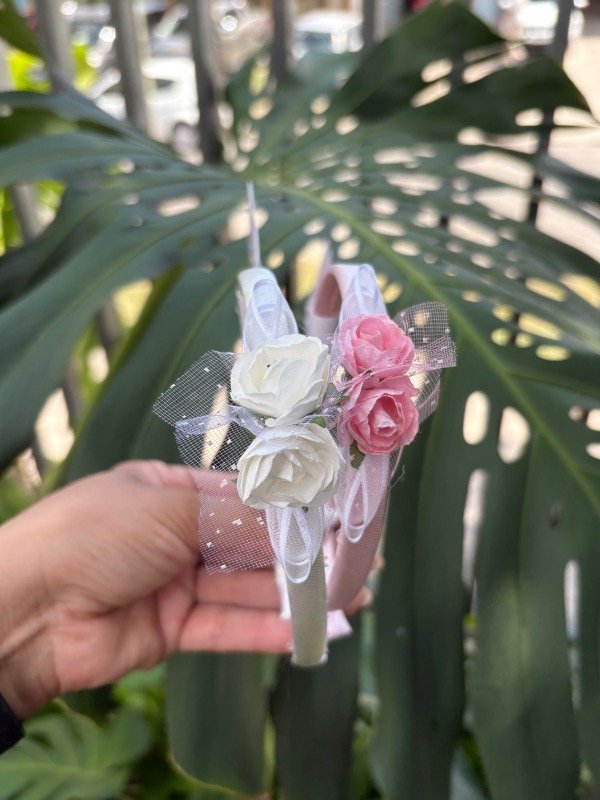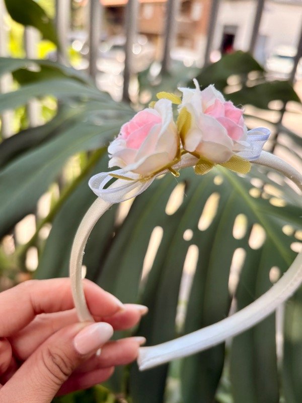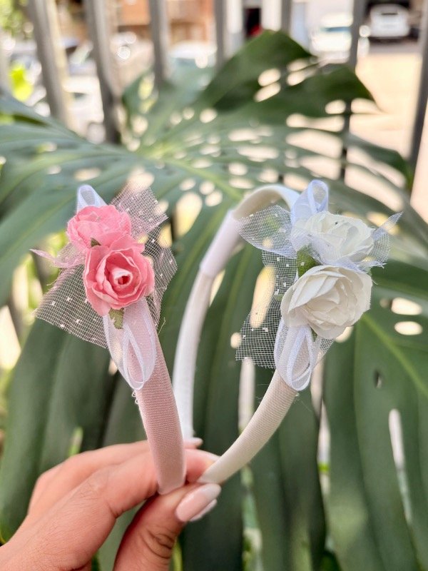 Hermosa vincha infantil decorada con delicadas flores y tul, perfecta para darle un toque dulce y especial a cualquier look.