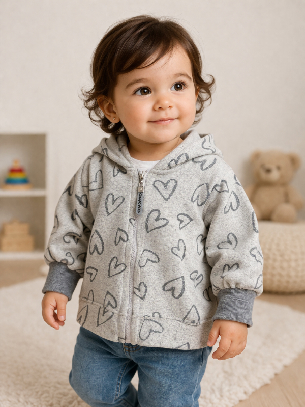 Está confeccionada en frisa suave color gris melange con corazones dibujados en tonos más oscuros, logrando un estilo tierno y minimalista.